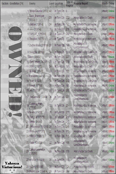 ” second faction I joined was Infinity Assassins. It was when real factions were still in their infancy, I became leader because the 4 members were inactive. Built it up, we ended up having 3 factions back then for the reasons dash stated. We reached a high of 18 on the hof with just over 10k of respect. Which was huge back then. Unlike Yakuza’s leadership structure, we had a leadership council and we could bounce around. We were mercenaries for hire, Guest chaining for our allies, Yakuza, HT etc. Those relationships are still strong today. We used to be known for our trash talk on the faction forums but since forums 2.0 we have remained quiet.